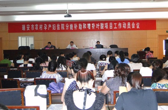 会上,卫生局疾控科科长徐飞鸿同志针对妇幼卫生项目实施启动工作进行了讲解,并对《瑞安市农村孕产妇住院分娩补助项目方案》、《瑞安市增补叶酸预防神经管缺陷项目实施方案》等二个文件进行了解读,对项目工作进行了部署。