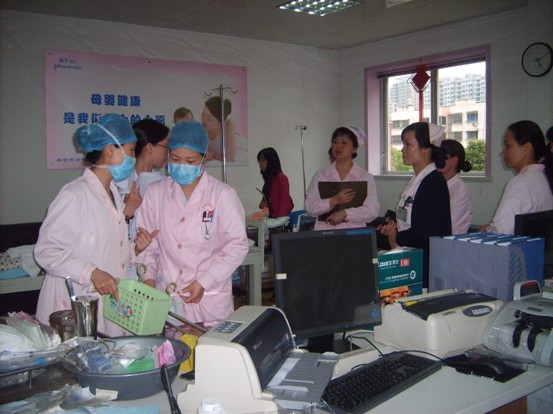 物品和人员准备就绪后,随着医务科长蔡兰富“演练开始”一声令下,急救工作就紧张有序地拉开了帷幕。首先是扮演A角色的胡晓娜助产士出现在场景中,评估产妇情况、接产、发现产后出血、呼救。随后医生迅速到位,下达医嘱,报告院总值;各扮演B、C、D、E、F角色的护士也马上相应就位,观察生命体征,开通静脉通道,复述和处理医生的口头医嘱,做好抢救记录;各辅助科室快速作出检查、协助诊断,危急值的报告;与家属沟通、知情告知;通知手术室等等,一场别开生面的抢救工作就这样在紧张而有序的氛围中进行着。突然,人群中传来一声:家属拒绝签字。手术室的护士长通知:手术室暂时无法接台。大家的心陡然悬了起来,但抢救人员并没有被这些突如其来的意外干扰,在迅速调整状态后,继续分秒必争地进行术前的救护。在行政人员与家属进行积极迅速协商后,问题得以调解,家属签字了,产妇终于被顺利护送进手术室。和手术室交接好后助产士整理物品和护理记录,演练完满结束。整场演练历时约半小时。