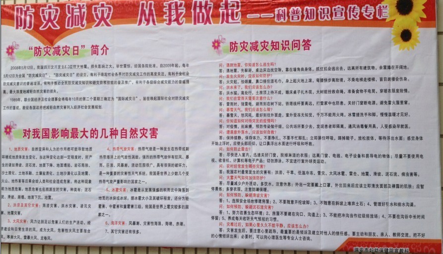 此次宣传活动,医院紧紧围绕“大力弘扬我国传统防灾减灾文化,大力弘扬抗震救灾精神” 的主题,务必使全院职工对于各种灾害的防范有了深刻的理解和较为全面的认识,大力提升职工防灾减灾意识和水平,增强避灾自救能力。
