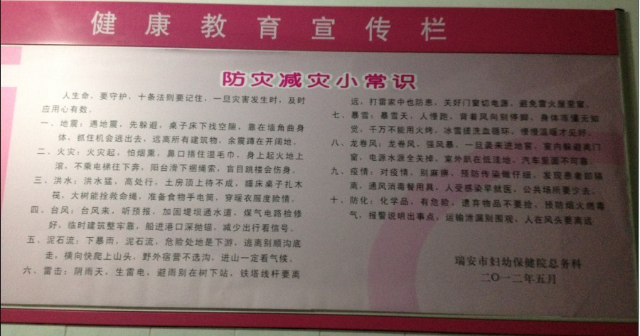 住院部一楼走道“防灾减灾小常识”宣传栏