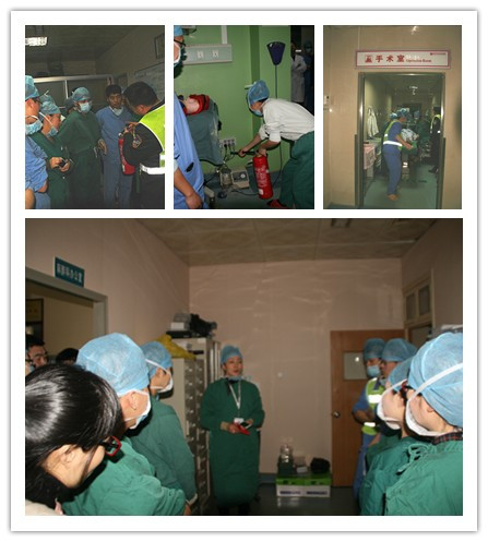 演练从初始阶段单一起火点到单一大火源的灭火流程及疏散转移开始;针对灭火器的使用方法,手术床转移时的简便性和打开停电状态下的电动门注意事项进行讲解;同时,针对手术造成脏器外露时的覆盖方法实际应用能力进行具体的操作演练。