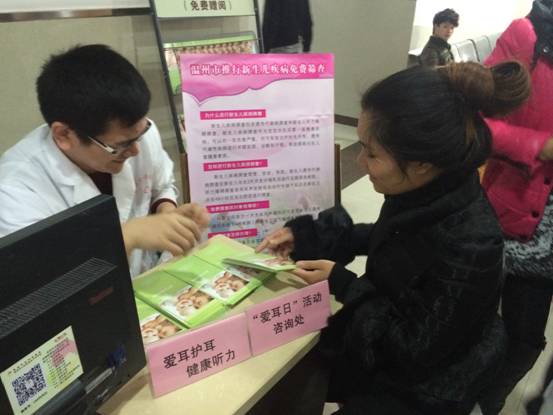 本网讯(通讯员 曾诗涵)今日,在我院二楼围产保健门诊分诊台处,设立了“爱耳日”公益活动咨询点,为前来咨询的市民提供现场解答、免费听力检查等服务。在此次活动中,我院为前来咨询的市民大力宣传初级耳科保健在听力残疾预防中的重要性;宣传初级耳科保健知识,做好健康教育、妇幼保健工作。与此同时,我院也开展了新生儿疾病免费筛查以配合本次“爱耳日”宣传活动,以便对疾病进行早期诊断和早期治疗。通过本次活动广泛地提高了市民的爱耳、护耳意识,促进了我市听力障碍预防与康复工作的进一步推动与发展。