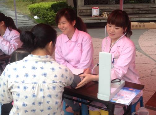 在体育小区的活动现场,血压测量、家电维修、管道疏通、开锁配锁、安全知识普及等摊点依次排开,为社区居民送上上门服务。妇幼志愿者们一早穿上了护士工作服,摆放好各类资料等待为社区居民服务。不少社区老人看到我们妇幼保健院志愿者的制服就纷纷前来咨询并接受免费血压测量。两位志愿者并为家中有孕妇的居民分发了我院的孕妇健康手册等等。