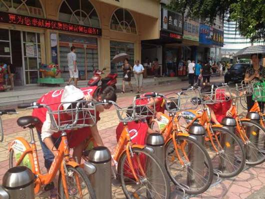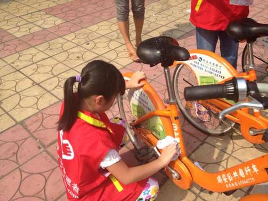 小志愿者们一大早来到公共自行车服务点,他们自带清洁工具,秉着“保交通工具清洁容颜、还城市绿色环保容貌”的理念,在团总支工作人员的带领下,从车手把、到坐垫、到车轮、到车身的各个角落,都用抹布进行了认真擦拭。经过1个多小时的清洁,该服务点的30余辆自行车焕然一新,小志愿者们的义务劳动受到了过路群众的一致赞赏和好评。