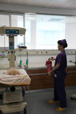 首先,由消控中心戈戟对新生儿科医护人员及护工进行消防“四个能力”知识培训。随后组织新生儿科医护人员按照火灾人员疏散应急预案进行应急灭火和人员疏散模拟演练。演练中,按医务人员发现火情、报警、组织人员扑灭初期火灾。特别是因明火造成大量的烟雾时如何组织人员疏散、疏散途中出现新生儿氧气皮管脱落,医护人员完成氧气皮管的连接及新生儿抢救,成了一个很好的看点。整个过程完成时长为3分钟。