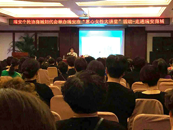 本网讯(外联部)10月23日下午,我院联合瑞安市个民协商城分会妇代会在华都大酒店北五楼A区多功能厅举办“蕙心女性大讲堂”走进瑞安商城健康知识讲座,由外联部主任赵小红主讲,270多名妇女聆听了此次讲座。
