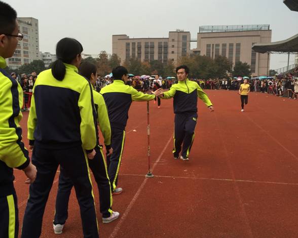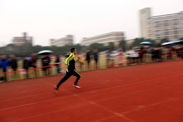 一切突然安静,只听见“啪”的一声,场上一下子热血沸腾起来,满是加油声、呼喊声,汇成了一支紧张激动的交响曲。第一棒,个个像一支支离弦的箭飞奔了出来,不一会儿,我院第一棒已经接棒给队友,远远把其它选手抛在身后,一个接着一个,接力棒稳稳得落在队友的手掌心里,队友抓紧接力棒冲出去的那刹那,我能感受到风刮到面庞的冲击感。此时已经是最后一棒了,全场只剩下两边人群排江倒海的呐喊声、加油声…有人瞪直了眼,有人绷紧了神经,有人扯着嗓,真是姿态各异!