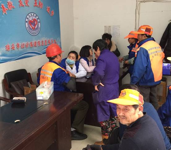 本网讯(通讯员 孙国芳)寒潮来袭,坚守在工作岗位上的环卫工人受到了社会各界的关注。1月27日我院的志愿服务队来到安阳环卫中转站,为这里的环卫工人开展现场诊疗服务。由于天气寒冷,环卫工人起早贪黑、工作强度大,血压容易升高,医务人员认真细致得为他们测血压,并对血压高的环卫工人进行登记,以便做后续的诊疗服务。志愿服务者的义诊活动,给在严寒中辛苦劳碌的劳动者送去温暖和关爱。