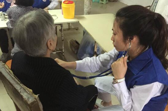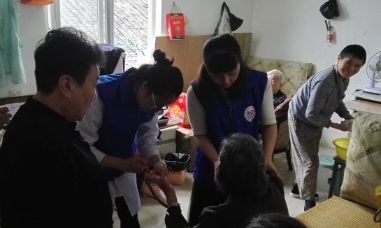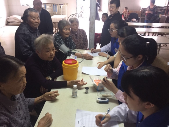 安雅敬老院坐落在玉海街道菜巷一个偏僻的角落里,是由原政府部门宿舍改装而成。当我们来到安雅敬老院时,院长和几位老人已经远远地在门口翘首等待。经过七拐八弯之后,我们来到了义诊的场所——一座破旧的食堂。我院内科医生钱若楠通过聊天的方式,了解他们的生活状况和身体情况,同时为他们进行了内科听诊。一旁的几位志愿者也井然有序地为在场的每一位老人测量血压和血糖。考虑到有些老人身体原因,另外三名志愿者兵分两路来到宿舍为坐在轮椅上的、长期卧床的老人进行一一检查。最后,我们对老人的身体检查结果进行统计,当看到最后统计表上显示的数据之后,我院外联部主任蔡兰富一再嘱咐敬老院的工作人员一定要时刻关注老年人身体状况,关心老年人的身体健康。