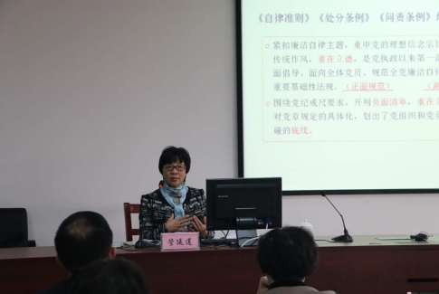本次培训特邀温州市委党校教授管延莲,副教授徐声响、梁德君,市直机关工委组织处处长陈爱英,分别从四个方面进行授课分享:一是以问责条例为保障,推进党风廉政建设《中国共产党问责条例解读》;二是共产党的执政优势和现实挑战;三是十八届六中全会精神解读;四是基层书记工作实务。