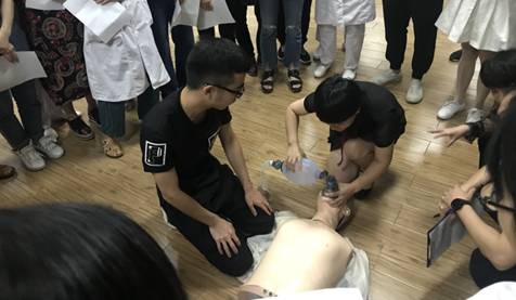 培训采用理论讲课与操作考核相结合的方式,钱松泉对如何判断病人心跳呼吸停止、心肺复苏的指征、操作步骤、救助过程中的注意事项、复苏成功的指征等进行了详细的讲授和演示,着重强调新的CPR进展、新的五环生存链、新的CPR操作顺序。随后,讲座老师做了双人心肺复苏术的现场演示,演示过程中老师特别指出了操作容易不到位的地方:双手要保持垂直、按压幅度5-6cm、频率100-120次/分、使用呼吸气囊时用CE手型紧压等。而后,大家以抽签方式,两人一组进行操作考核。