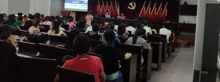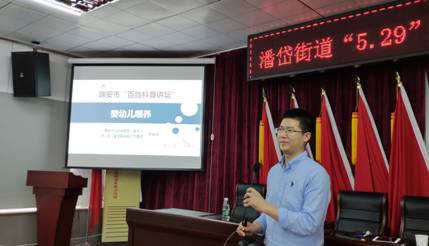 (本网讯 儿科)5月23日下午,我院儿童中心郑俊虎主任应潘岱街道办事处邀请,到莘塍街道办事处,为家长朋友作“婴幼儿辅食添加”知识讲座,全场共有122位家长参加听课。