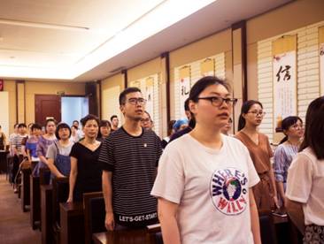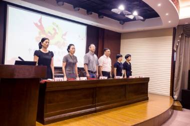会议开始,全体党员佩戴党徽,以高昂雄壮的国歌声拉开序幕。