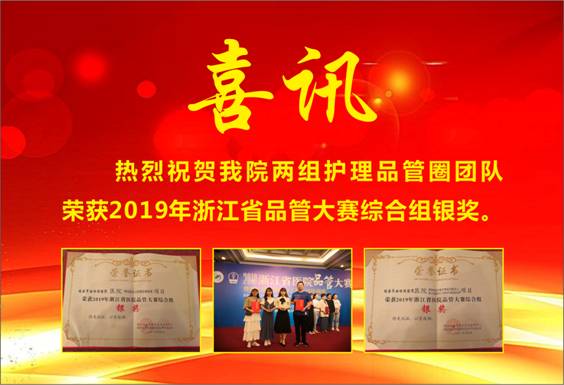 本网讯(通讯员 丁小雪)5月21-23日,由浙江省医学学术交流管理中心、浙江省医疗质量控制与评价办公室主办的2019浙江省医院品管大赛暨医疗质量管理与工具应用培训班在杭州市隆重举办。来自全省的236个项目报名参加本次大赛,专家们进行背对背的严格打分,最终综合组100个项目入围现场成果汇报。经过激烈的角逐,我院的两组护理品管圈项目均获得综合组的银奖。