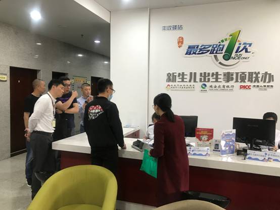 首先,来宾们参观了新生儿出生事项联办窗口的环境,陈文伟院长向他们介绍了各个窗口所办事项的流程,介绍了新生儿出生联办在我院办理的便利与好处。同时,参观人员与各窗口的工作人员进行交流,了解各办理事项的相关流程与注意事项等。