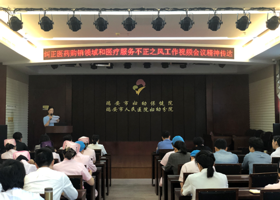 党总支宣传委员王瑞舟首先传达了纠正医药购销领域和医疗服务中不正之风部际联席会议第二十次会议视频会的主要精神,并着重对温州市卫健委党委副书记徐斌同志的讲话进行了详细解读:当前和今后一段时期,我市整治医药购销和医疗服务不正之风的工作重点是有效遏制医药购销和医疗服务中收受“回扣”、“红包”和乱收费等违规、违纪、违法行为,营造风清气正的医疗服务环境;以“最多跑一次改革”为切入点,全面提高医疗质量、改善服务态度、优化医疗流程、降低医疗费用,切实缓解群众“看病难、看病烦、看病贵”等问题;进一步加强医德医风建设,建立和完善行风管理制度,弘扬正气,表彰先进,树立一批医德高尚、服务优良、医术精湛的先进典型。