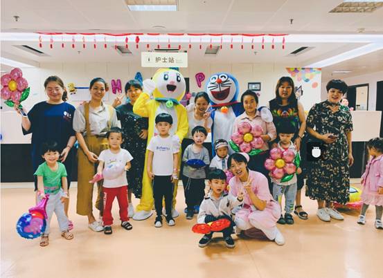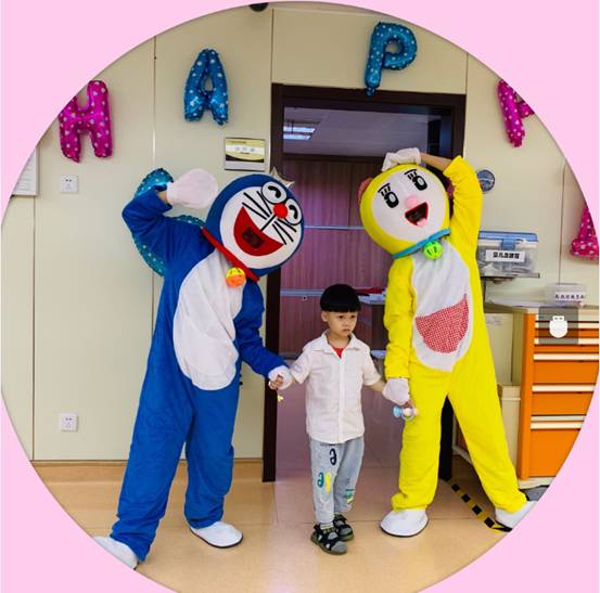 6月1日中午11:30分,在小朋友们吃完午饭,做好治疗之后,由美丽的护士姐姐打扮的哆啦A梦来到病房邀请小朋友们一起参加这个别样的“儿童节”。为了这次节日,普儿医务人员提前三天用气球和卡通图贴装扮病房,为患儿营造了童趣和温馨的环境。随着歌曲《海草,海草》的音乐响起,普儿护士站前面,“哆啦A梦”和小朋友们一起踏着节拍,扭着屁股,一起唱啊跳啊,欢声笑语飘洒到普儿病区的每个角落。音乐结束后哆啦A梦和护士长分发了精心准备的小礼物,小朋友们手里拿着的手拍鼓,手摇铃、布朗熊气球等玩具,露出了开心的笑容。