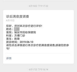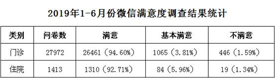 推行微信满意度调查。考虑到当面填写满意度问卷的可信度及服务对象的心理压力,医院推出手机微信满意度调查,增强调查的真实性,由监察室对被投诉人进行调查核实,有效投诉转投诉办公室处理,一般服务态度问题,由门诊部、监察室进行诫免谈话。2019年上半年共收到微信问卷门诊27972人次,住院部1413人次,不满意率均未超过2%。