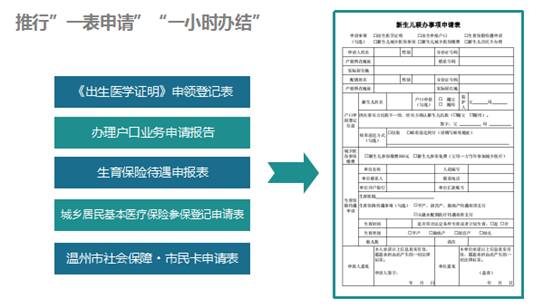 新生儿出生事项联办。紧紧围绕“个人全生命周期”“一件事”,借力市场化运作,全省首创政府、医院、银行、保险四方合作机制,新生儿父母“跑零次”或“跑一次”,即可1小时办结新生儿6个事项。我院“一站式”联办点于3月26日正式运行,截止6月底,瑞安户籍出生数668人,完成六事项联办563件办证率84.3%。7月4日开始办理新生儿接种证,截止到7月9日,一共办理了119份。