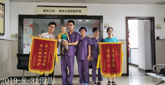 8月31日上午,水晶宝宝田奕鸣和爸爸妈妈一起来到新生儿科接待室。为表示对医务人员的感谢,送来了两面锦旗,红红的锦旗上印着显目的大字,温暖人心。“医德高尚,情暖人心”、“家一样的温暖,亲人般的呵护”,无声的文字,有声的感谢,深深地打动了我们。谁也不曾想到,一个出院一年多的宝宝突然来访,带来了感谢。这便是对我们工作最好的肯定。父亲母亲真诚的说着,“谢谢你们,谢谢你们!”他们流露出最真实的情感,一个孩子的健康成长是每一个家庭最真实的期望,使我们感同身受。然而,这对我们而言,就是我们的工作,是所有医务工作者的职责!