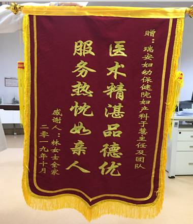 相信这是每一位医生最愿意听到的、最温暖的一句话。不禁让我们想起了医学生宣誓誓言的第一句话:健康所系,性命相托。我们科室针对这位孕妇的病情积极组织全院多科室术前讨论,研究解决方案,集思广益,专门采购了硅胶材质的导尿管,并做好术中及术后出现过敏性休克的防范措施及治疗措施。最终手术顺利进行,新生命平安降生,产妇术后恢复佳。术后该妇及其丈夫连连感谢“医生,辛苦你们了,真的是非常感谢你们”,并给我们的主刀医师于慧及其团队送来了锦旗,锦旗上“医术精湛品德优、服务热忱如亲人”几个大字格外耀眼。