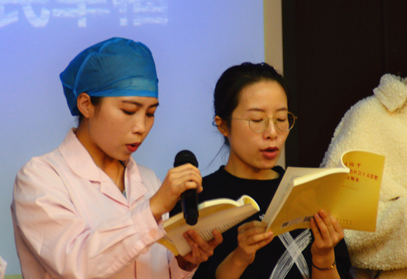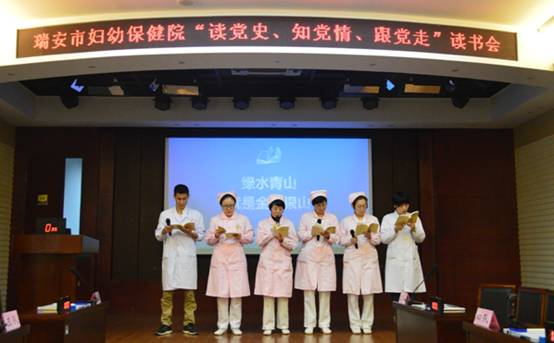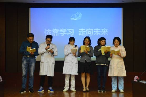 读书会上,临床第二支部、临床第一支部、行政后勤支部三支部各派出6位代表,成立朗诵小组,以《习近平新时代中国特色社会主义思想学习纲要》为朗诵范本,分别朗诵了“中国人的本质是国家富强、民族振兴、人民幸福”、“绿水青山就是金山银山”、“依靠学习,走向未来”等篇章。饱含激情、铿锵有力的朗诵声久久回荡,感染全场,表达着党员同志们为共产主义事业奋斗终身的郑重承诺和“不忘初心、牢记使命”的决心。