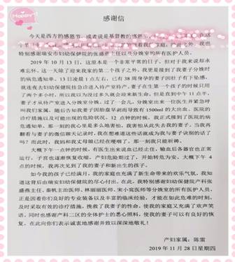 薄薄一纸感谢信,浓浓一份医患情。感谢信写了满满一页纸,上面详细的描述了10月13日当天发生的事情,凌晨1点左右,原本欣喜等待妻子分娩的陈雷先生(产妇蔡程莉的丈夫)却接到医院的病危通知单,医生告知其妻子蔡程莉在分娩时出现胎盘早剥,出血大于1500ml,情况非常紧急,需要立即启动院内急救,他一时慌了阵脚,害怕就这样失去妻子。好在我院三线医生、院总值很快到场,经过各线医生、助产士们积极配合抢救,竭尽全力挽救两条生命。下午13点左右,经过大家的努力,产妇出血止住了,各项生命体征恢复正常,医生告知家属产妇已经渡过危险期,陈雷先生和家里人才松了一口气,心里的大石头落了地。