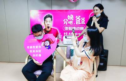 “分娩之旅”的第三站---特需产区,团长带领准爸妈们参观产科VIP病区并讲解VIP预约流程,跟随准妈们前来分娩旅行团的准爸们轮流体验分娩镇痛仪,准爸爸们发出阵阵尖叫声,准妈妈则在一旁摸肚子鼓励。体验阵痛分娩时,好几位准爸爸发出喊叫,“就生一个,再也不生了,太疼了!”“求求你,放过我吧,实在受不了啦!”各位准爸爸们在体验的时候,准妈妈们也是在一旁乐开了花,纷纷拿起手机记录这个有意义的一刻。