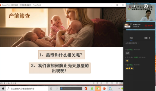 9月11日上午9:30,产科副主任医师胡丽文的《孕期保健》线上课堂在我院八楼母婴健康中心孕妇育儿学校准时开始。胡医生语言风趣幽默,她结合临床讲述了孕期保健的重要性,详细介绍每次产检的内容及孕期需要注意的饮食情况等,强调中期产前筛查的检查时间与检查目的,以及减免政策的补助申领等等,线上实时有50余人聆听授课。