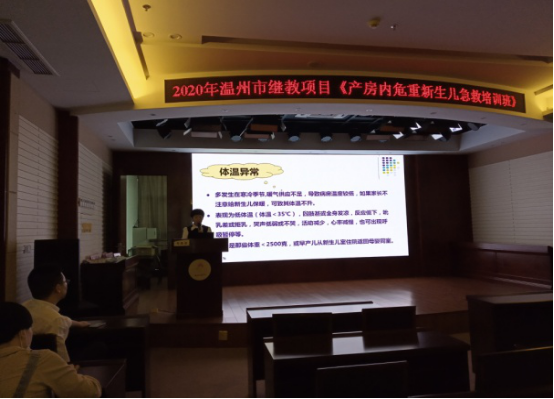 本次培训由我院副院长柯汝淑致辞并主持讨论,温医大附属育英儿童医院周小坚教授、我院副院长陈秀清、产科主任刘郑洁、护理部主任郑骆颖、儿童健康中心主任郑俊虎主任、儿科医生钟西鹤、普儿病区副护士长王晓丽受邀参加授课,全市共计79名医护人员参加学习。