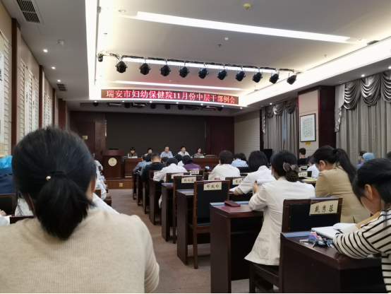 本网讯(通讯员 胡秋萍)11月18日下午,瑞安市妇幼保健院11月份中层干部例会在九楼多功能厅召开。我院党总支书记葛体池,党总支副书记、院长陈文伟,副院长陈秀清、余雪梅、柯汝淑出席会议,全体中层干部参加此次会议。