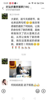 “之前所有的医生都和我说,你这个难怀孕哦,要很麻烦之类的,说的感觉我这辈子不能生了一样)直到今年我9月20日末次月经,我又去找了何妈,我说:我要结婚了,我想怀孕,她说好!交给我,配合我!于是10月份我配合何妈一共来医院4次检测排卵时间,等待开奖,10月20日就测出怀孕了,那时候胎儿小,验血还以为是双胞胎,到现在两个月胎儿大了发现是三胞胎!非常感谢何妈!”