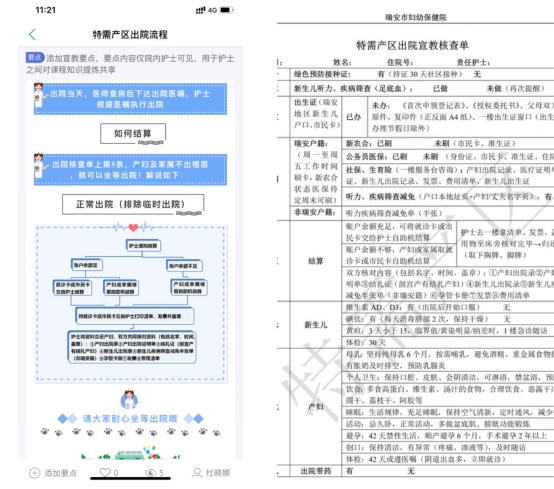 3. 对宣教内容进行更新,组织学习,制定出院宣教核查单。让产妇及家属对出院相关事项了然于心,并且还推出了科室特色服务——“出院结算零次跑”。