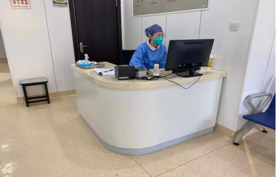 在分诊区,值班护士可为患者办理排号、测量体温、登记相关信息。