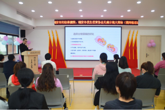 首先由瑞安市妇幼保健院麻醉科副主任医师余敏倾情演讲,他就缓解分娩疼痛的方法、分娩镇痛的好处、分娩镇痛的时机、分娩镇痛前后的准备工作给大家做了详细的讲解,同时提醒孕妈妈们麻醉结束后要注意休息,为第二产程做好准备,讲解内容简洁明了、浅显易懂。