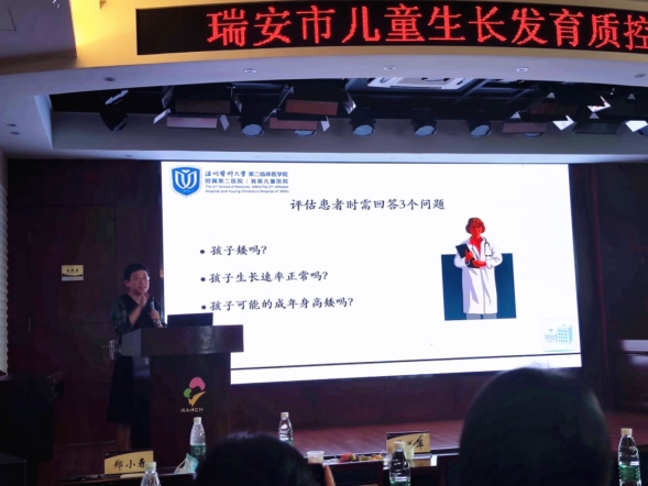 在学术会场,董关萍主任和单小鸥主任现场开展专题讲座,围绕儿童体格发育评估与管理临床实践专家共识、矮小症的规范化诊断与治疗等课题进行了全面解读,并就儿童保健和儿童生长发育专科临床工作中碰到的难点问题与大家进行重点讨论。会议由瑞安市妇幼保健院儿童保健门诊主任黄益华和瑞安市人民医院医保科科长曾绮丹主持。