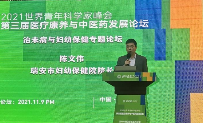本网讯(通讯员 金环环)11月9日,2021世界青年科学家峰会——第三届医疗康养与中医药发展论坛在浙江温州南塘中医药特色街区举行。此次论坛主题为妇幼保健与中医药,邀请国家卫健委领导、国家中医药管理局领导、院士、国医大师、权威专家、资深学者等通过主旨报告、主题发言、圆桌论坛和项目考察的形式助力妇幼保健和中医药传承创新发展,瑞安市妇幼保健院党总支副书记、院长陈文伟受邀出席论坛。