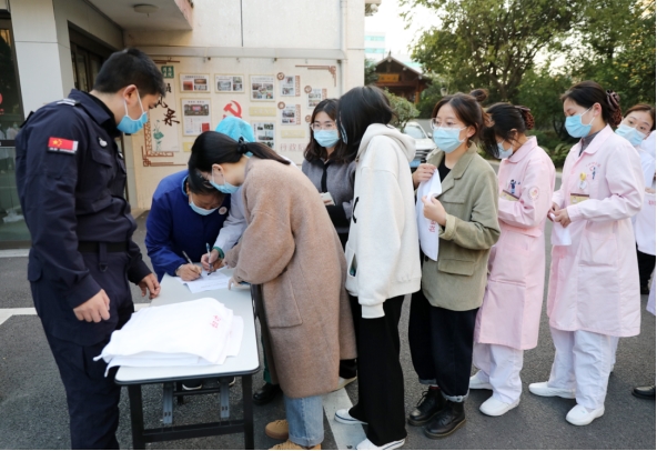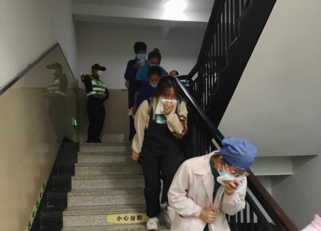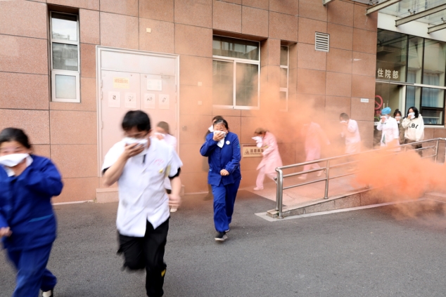 消防知识讲座结束后,开始组织应急疏散逃生演练,模拟9楼会议室发生火灾,火势迅速向四周蔓延无法控制,并产生大量浓烟。医院启动火灾疏散应急预案,在各层楼疏散引导员的引导下,会场参训人员用湿毛巾捂住口鼻,顺墙弯腰有条不紊地快速撤离火场到达一号楼前的空旷地带,最后清点撤离人员人数,整个疏散演练不到五分钟完成。