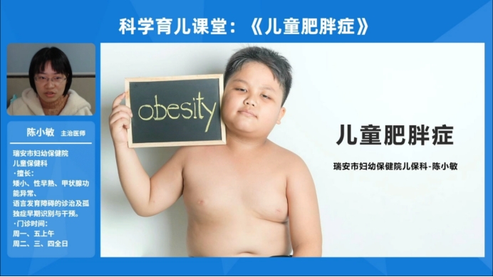 12月21日晚上7点,瑞安市妇幼保健院儿童保健门诊本着指导家长科学育儿、让孩子健康成长的理念与目的,特别邀请儿童保健门诊主治医师陈小敏以《儿童肥胖症》为课题,进行了一次详细的线上科学育儿课堂。