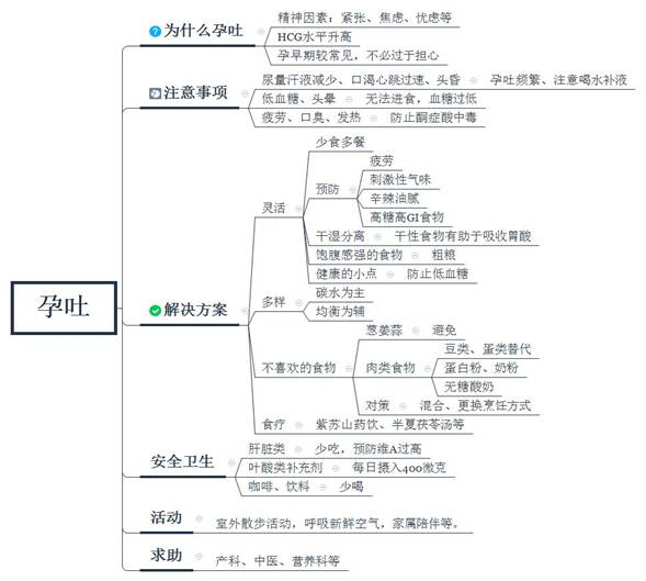 平时也可以在身边准备一些健康的零食,总之千万不要让自己太饿避免出现低血糖。建议少食多餐,一天吃个五六次。另外水一定要保证多喝,热水、冰水、温水都可以,只要让自己觉得舒服就行。冰的食物相对不容易引起恶心,可以酌情试一试。注意一下自己吃什么东西会恶心,适当避免。很多人可能会对于气味冲的、辛辣的、糖分过高的食物比较敏感,包括像大葱、大蒜。也可以尝试着选择一些比较能够让孕妈妈接受的食物的形式,像沙拉、水煮等等,总之能吃下去就好。