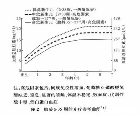 光疗是目前公认的治疗黄疸安全有效且严重副作用小的方法。光疗常见副作用包括发热、腹泻、皮疹,通常都比较轻微,停止光疗后会很快恢复。光疗的标准参照Blutani曲线,而不是一个固定的数值。见下图。
