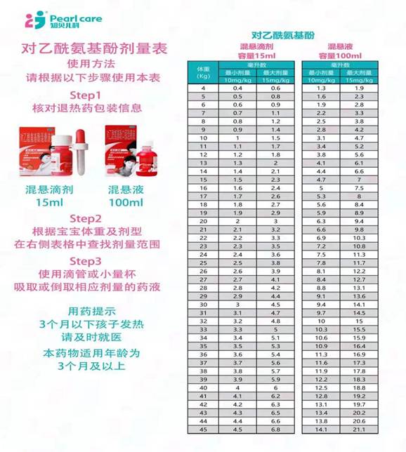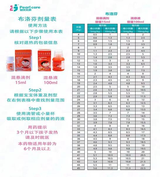 2)美林每隔 6?8 小时可重复用药一次,每 24 小时不超过 4 次,适合 6 个月以上的孩子。美林使用剂量请参照下表: