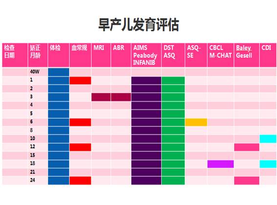 7、早产儿出院后发育评估:根据早产儿矫正月龄,对照下表中项目进行定期随访。