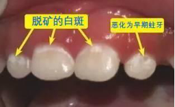 这时牙齿脱钙部位的颜色和透明度发生变化,外观呈不透明的白色,颜色有点像白色的粉笔,就是我们俗称的“脱钙”了。白斑正是牙齿开启蛀牙之路的源头。此时宝宝可能没有任何的自觉症状,常常不引起家长重视,如再加上不认真刷牙,食物残渣遮盖牙齿就可能发现不了早期龋。之后色素沉着后会变成黄褐色或黑褐色。