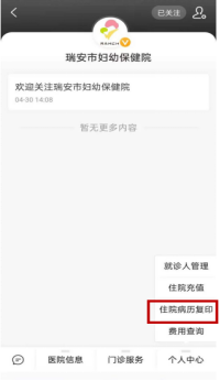 1.打开支付宝,搜索“瑞安妇幼保健院”并关注生活号点击进入,右下角个人中心选择住院病历复印。
