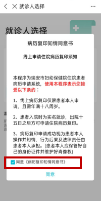 2.点击进入后请认真阅读“病历复印知情同意书”并勾选左下角。