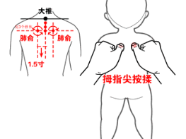操作:同时在两侧肺俞穴上揉动,揉3-5分钟,可起到益气补肺、止咳化痰的作用。