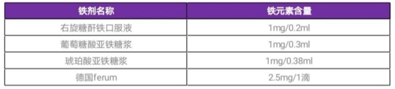5.补充铁剂(建议在医师指导下补铁):1)开始补充铁剂时间:出生后半个月至1个月,一般补铁1个月后复查血常规,评估补铁量是否合适。2)补充铁剂时间1年。3)补充铁的剂量:根据喂奶种类不同,补充剂量不同:纯母乳或普通配方奶喂养,每天补充元素铁2~4mg/kg;早产儿配方奶或母乳+全量母乳强化剂(雅培牌子),补铁每天补充元素铁1mg/kg;全量母乳强化剂(雀巢牌子)可以不用补铁。每餐喂铁剂不要超过2mg/kg。4)市面上常见铁剂元素铁含量: