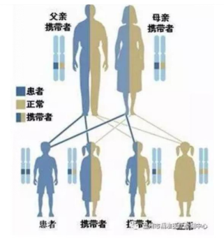 当夫妻双方为同类型地中海贫血的基因携带者时,每次怀孕,其子女有1/4的机会为重型地贫患者,1/2的机会为基因携带者,1/4的机会正常。