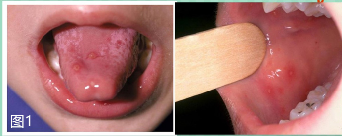 2.口腔疱疹—位于腭弓前方,最常见于舌部和颊黏膜(图1);其次见于唇龈沟和软腭及硬腭上;偶尔出现在悬雍垂,唇和扁桃体上。